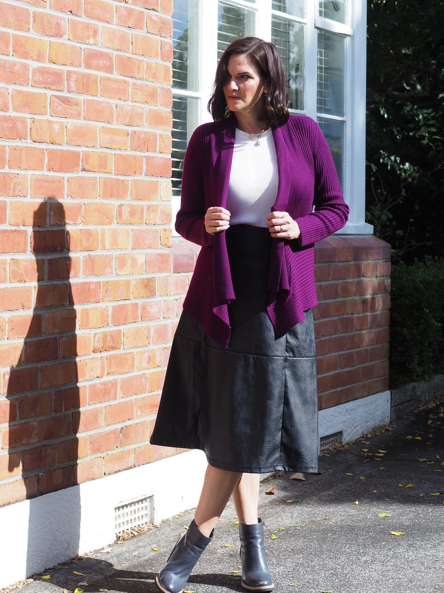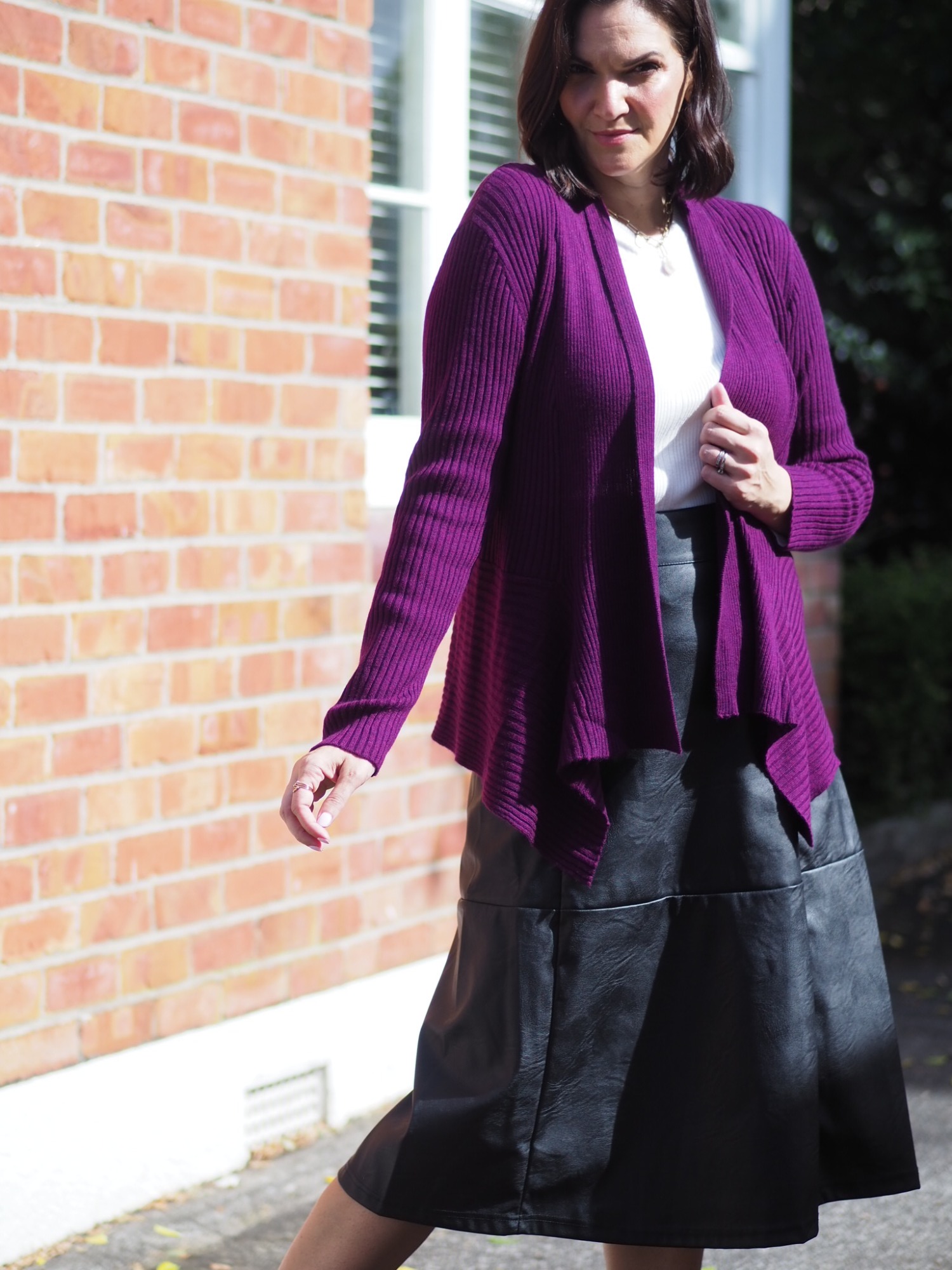 I’m wearing: The Fine Cosy Knitwear Cardigan in Berry Marle with the Viscose Rich Knitwear Jersey in Ivory and the Leather Look Skirt