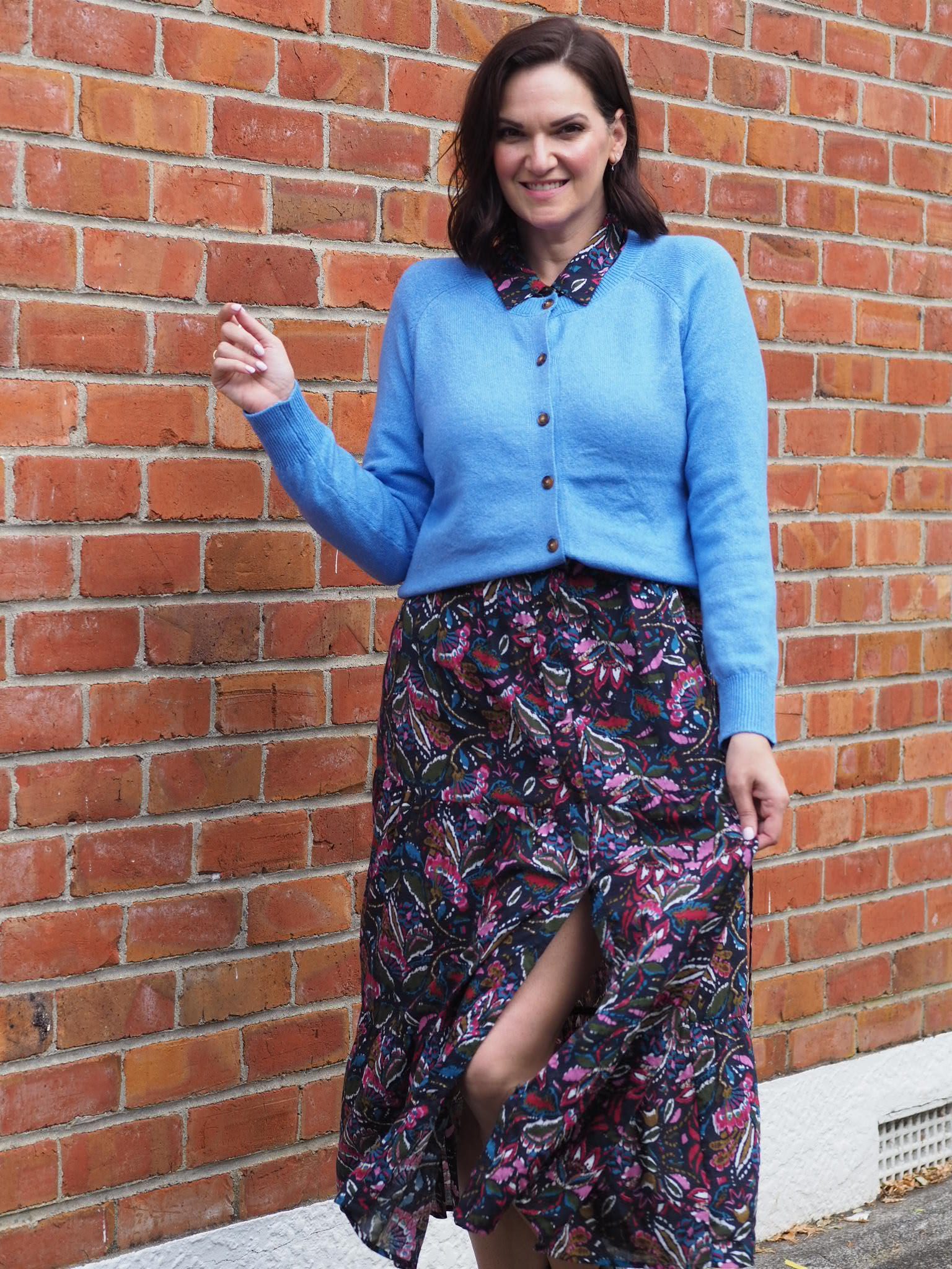 I’m wearing: The Printed Rayon Cotton Dress in Navy Olive Floral with the Ultra Soft Knitwear Cardigan in Sky