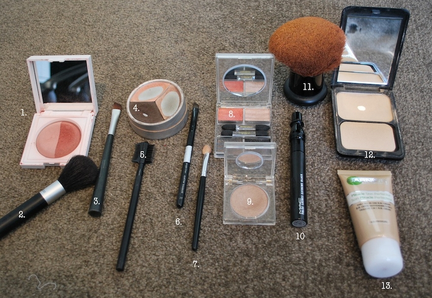 Ok so here are the products and tools I used to help create my ‘face’ – these are just items I have in my make-up bag, I’m sure you have something similar in yours…..