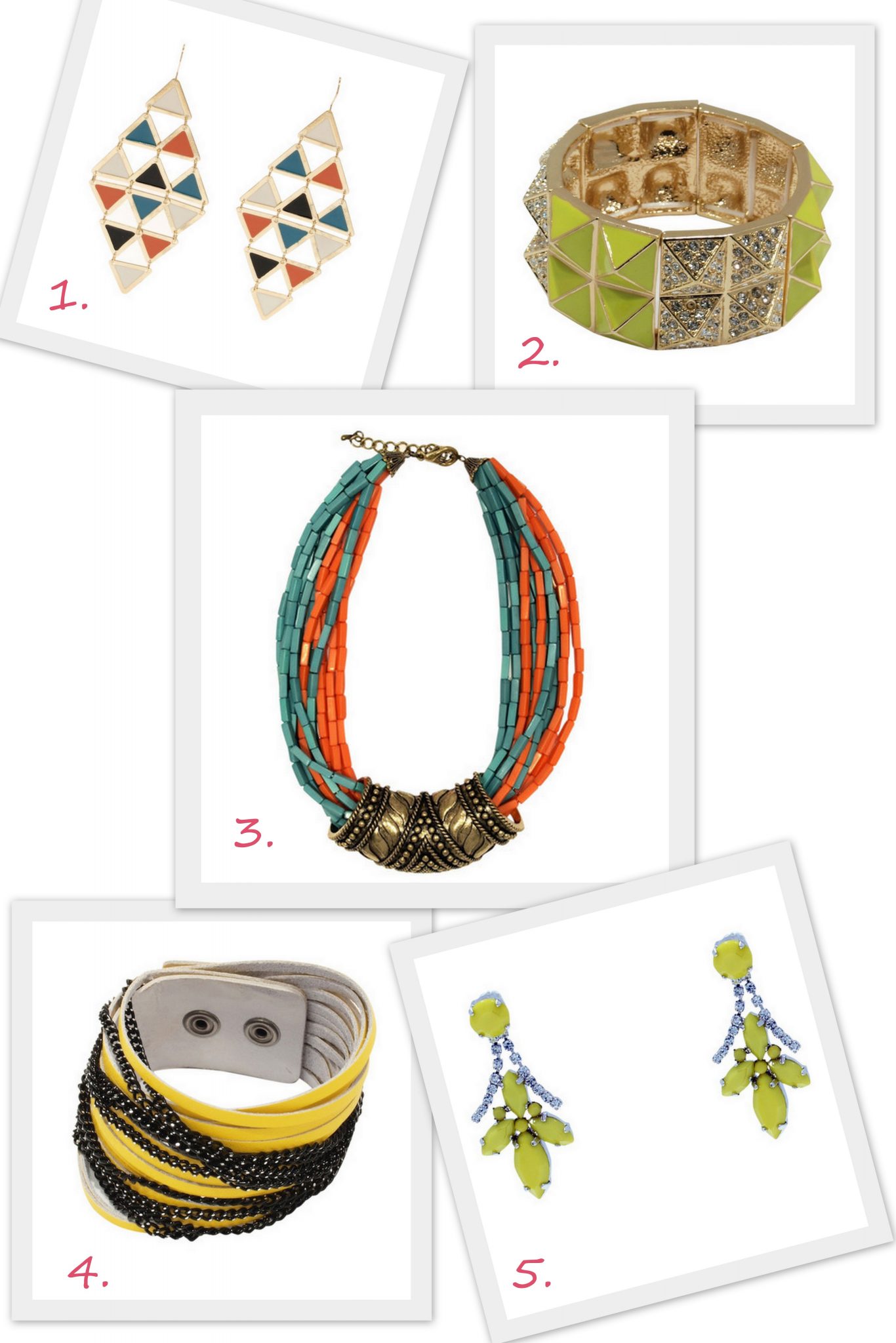 1.Sunrise earrings $19.00 2. Pina Colada bracket $79.00 3. Warrior necklace $39.95 4. The Go To Girl bracelet $34.95 5. She’s a Maniac earrings $24.95