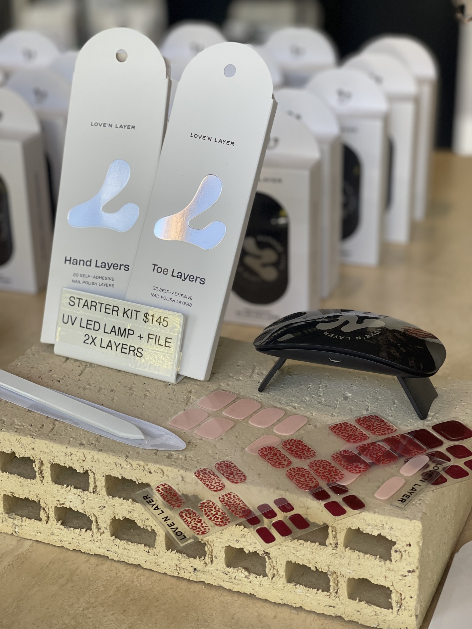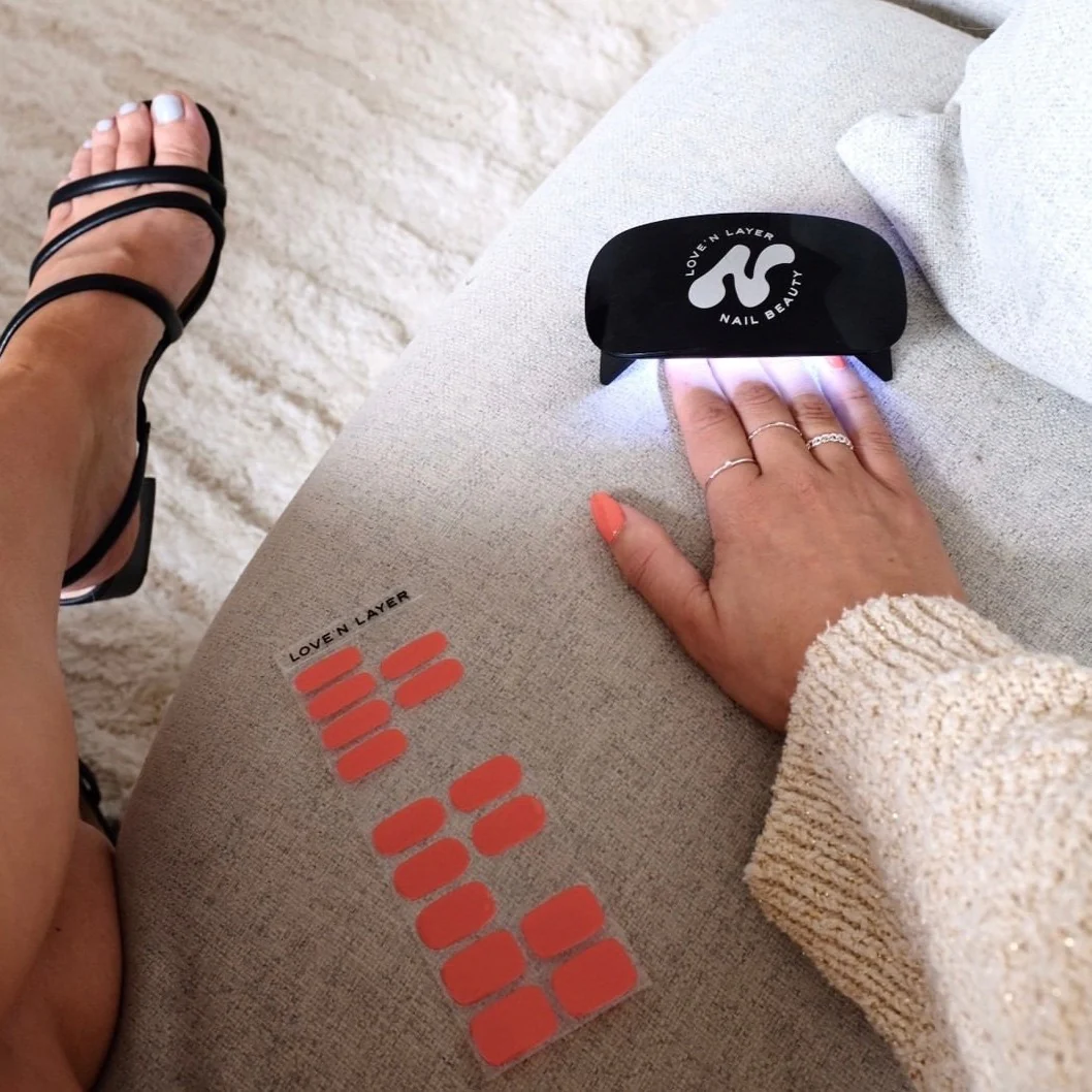 So to start yourself off on this amazing new nail journey, you’ll need to grab a pack of hand layers, a glass file, and if you want to set the gels, a small UV lamp.