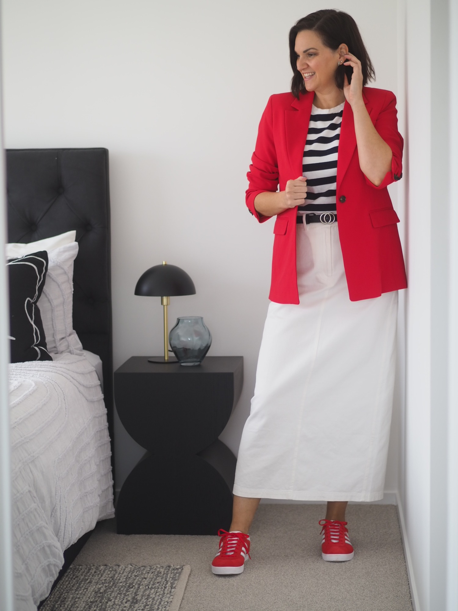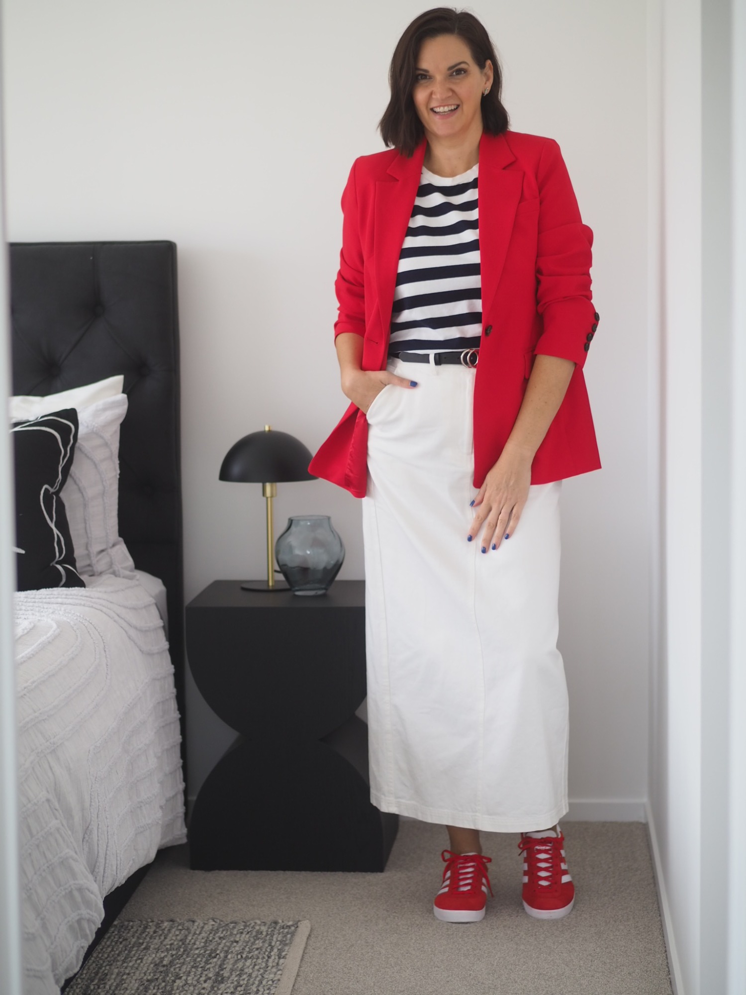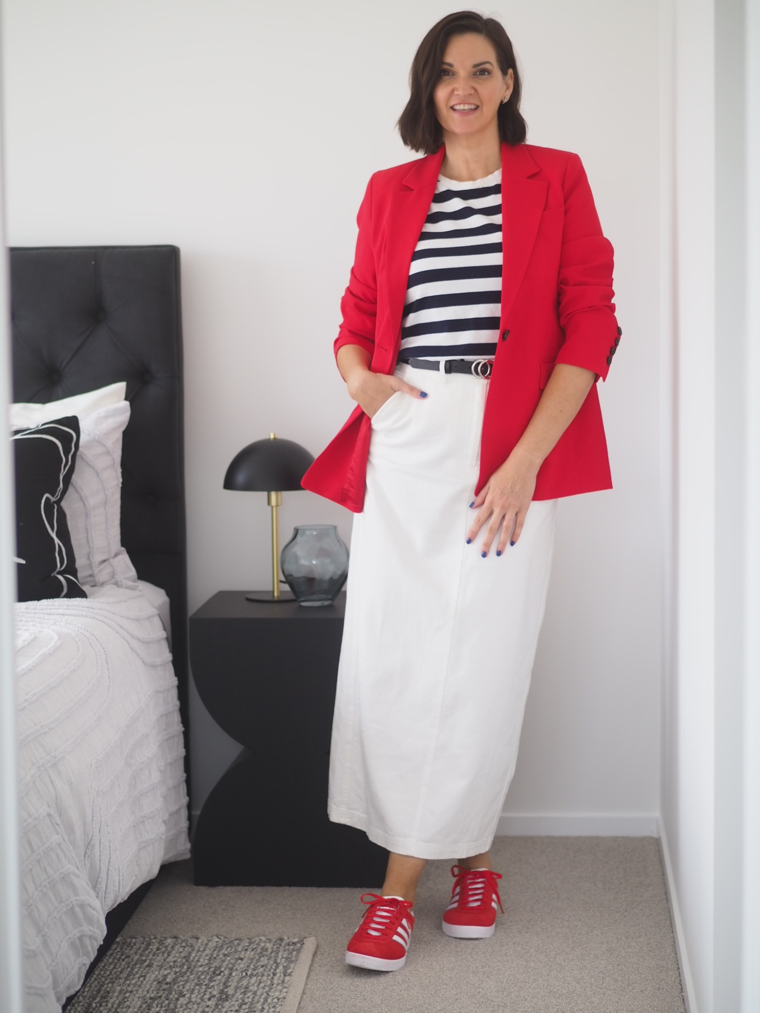 - The 3 Colour Rule: A simple yet effective guideline is to limit your outfit to three colours. This creates a cohesive look without being overwhelming. Your base colour often takes up most of the outfit, a secondary colour adds depth, and an accent colour provides pops of interest. Let’s have a look at an example…. In this outfit, WHITE becomes the base colour, I’ve used accents of red to add depth by contrasting the white, and then the navy stripe makes the look pop