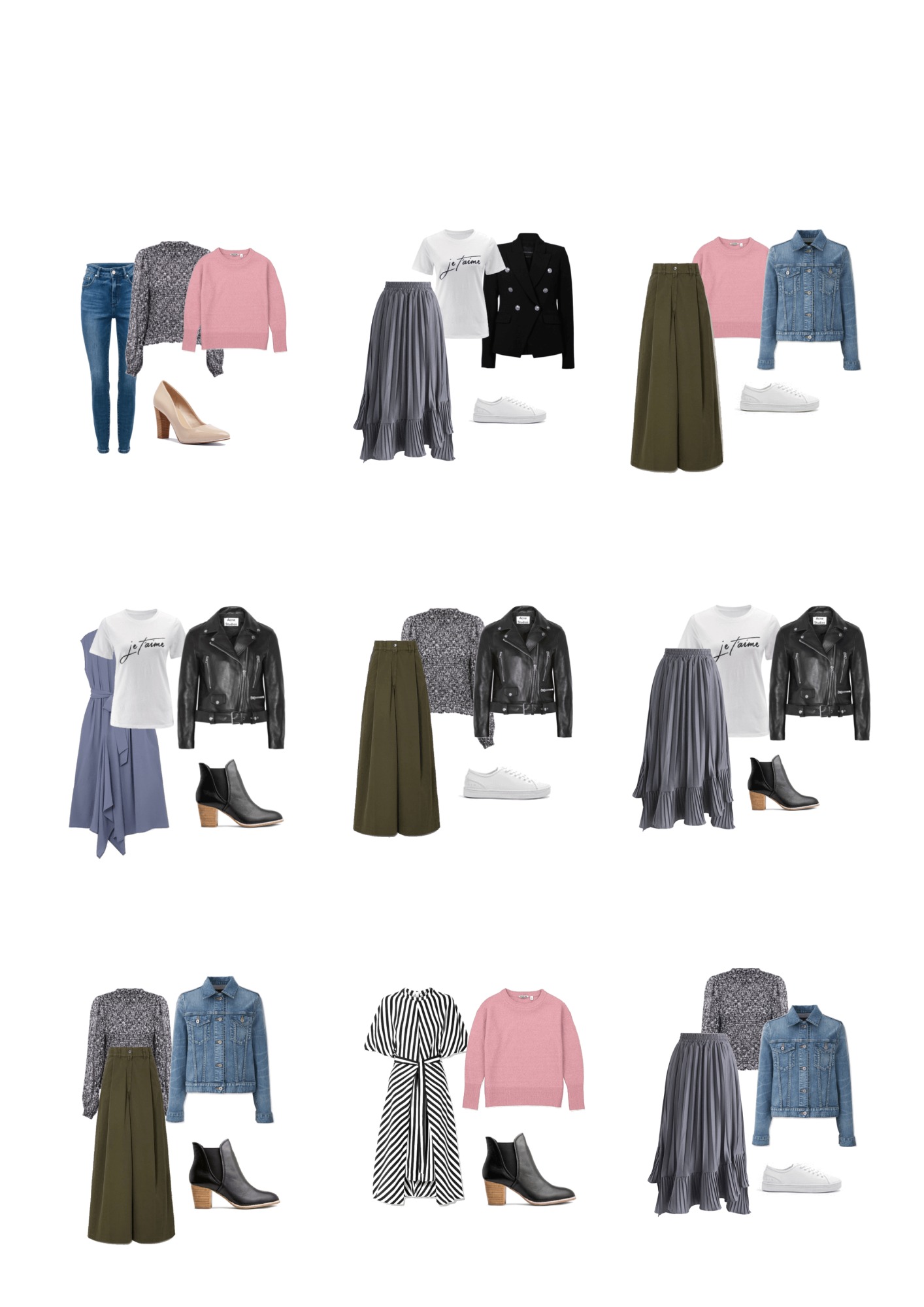 In this digital ebook, I’ve listed 16 generic wardrobe items (a pair of jeans, a denim jacket etc) and showed you OVER 50 different ways to pair them all together.